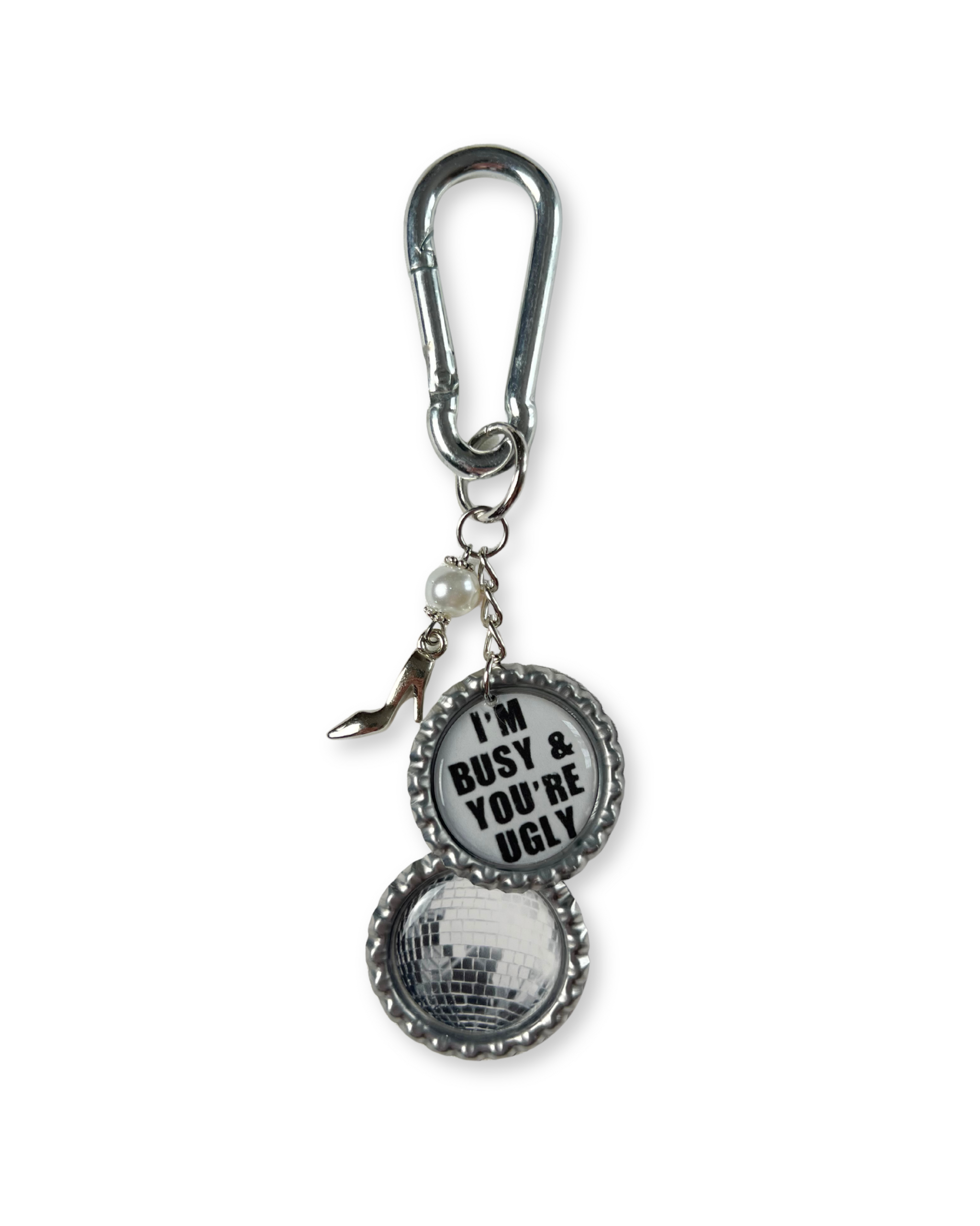Handmade bag charm, crafted with repurposed aluminum bottle caps and charms, anchored on a stainless steel carabiner hook.