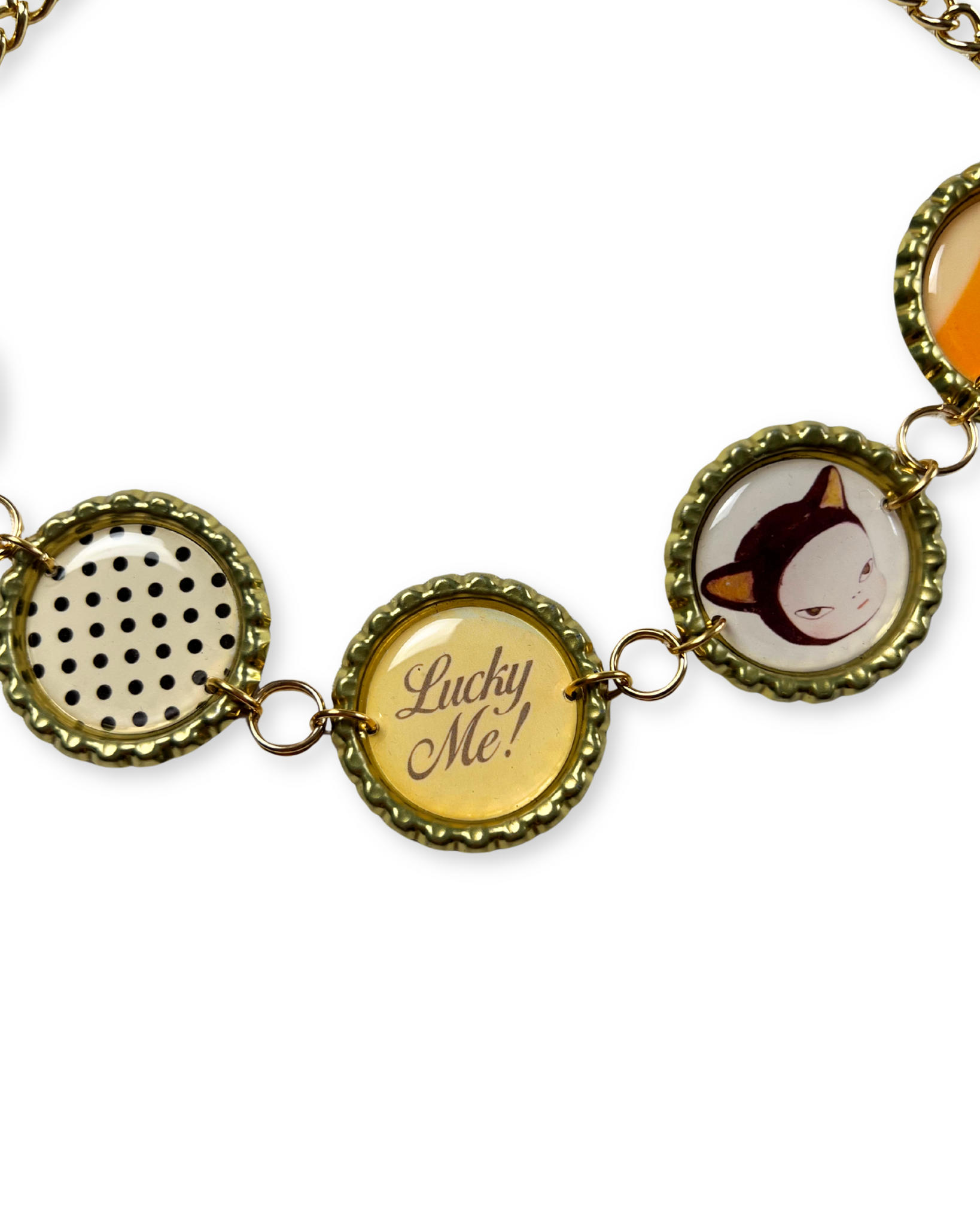 A handmade chain necklace made with repurposed aluminum bottle caps on a gold stainless steel curb chain. Lobster clasp closure with a 2" extender.