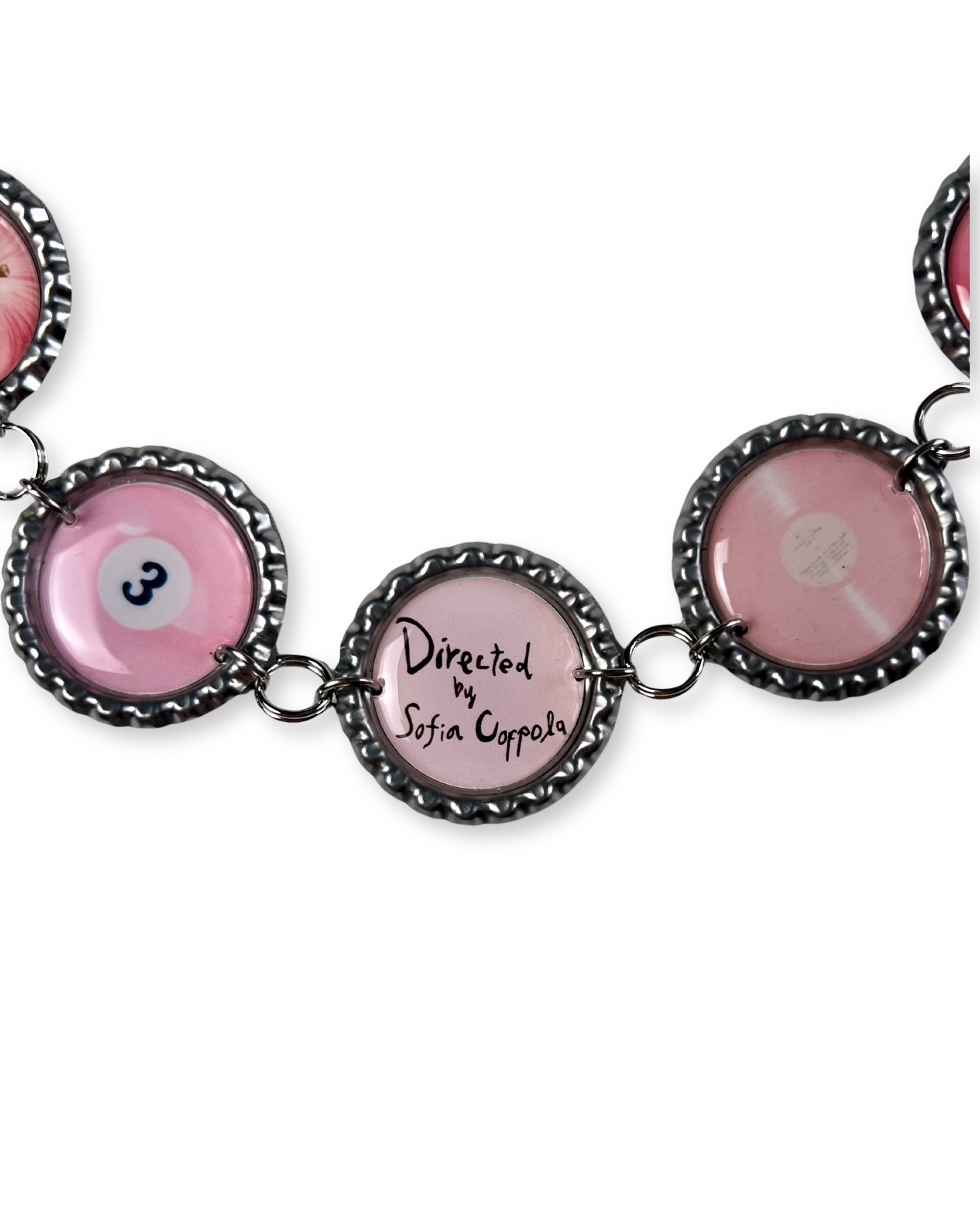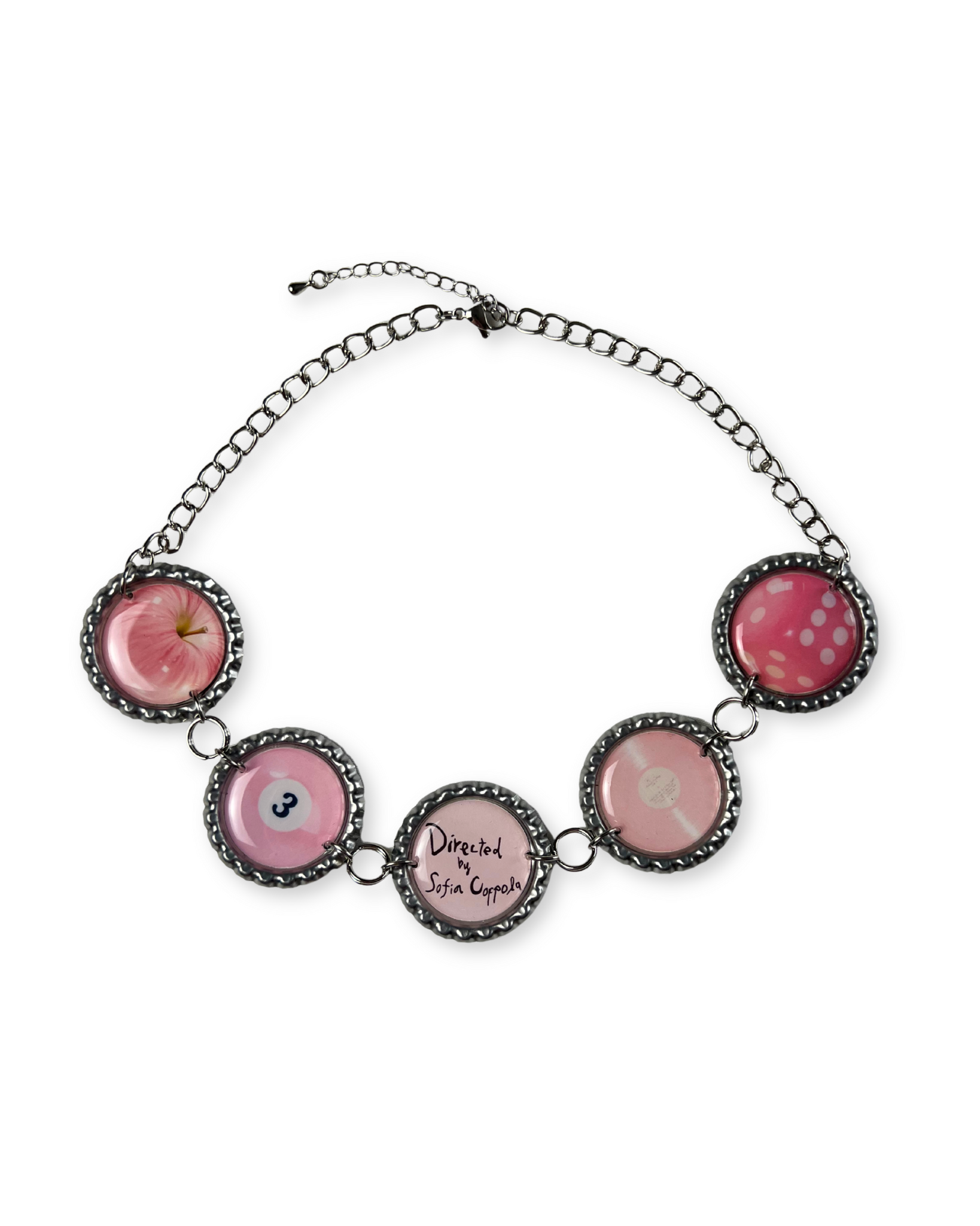 A handmade chain necklace made with repurposed aluminum bottle caps on a stainless steel silver curb chain. Lobster clasp closure with a 2" extender.